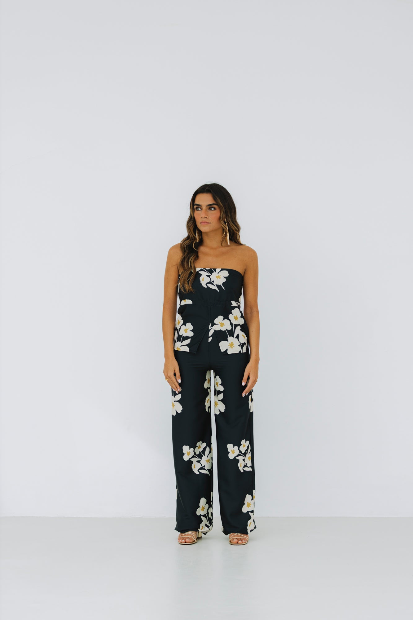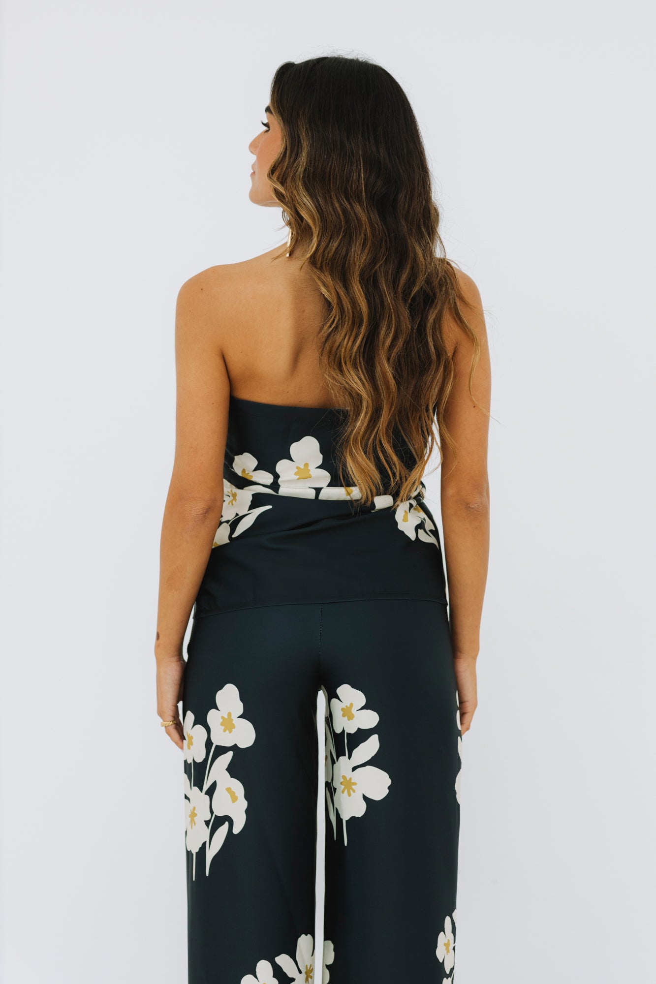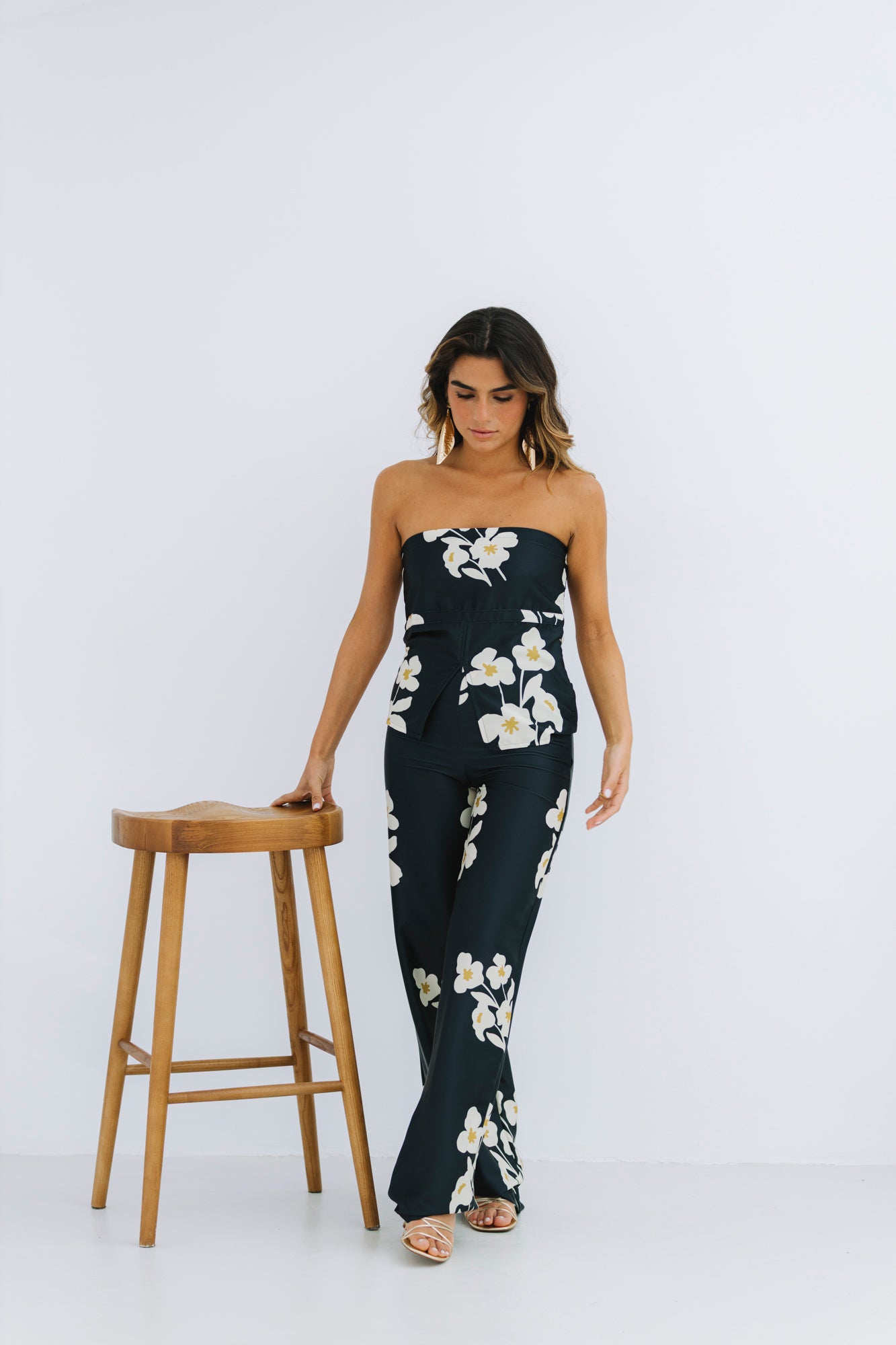 Num tom preto com estampado floral na cor creme e verde lima, é uma peça irreverente, o tecido tem acabamento acetinado, trazendo um toque elegante.