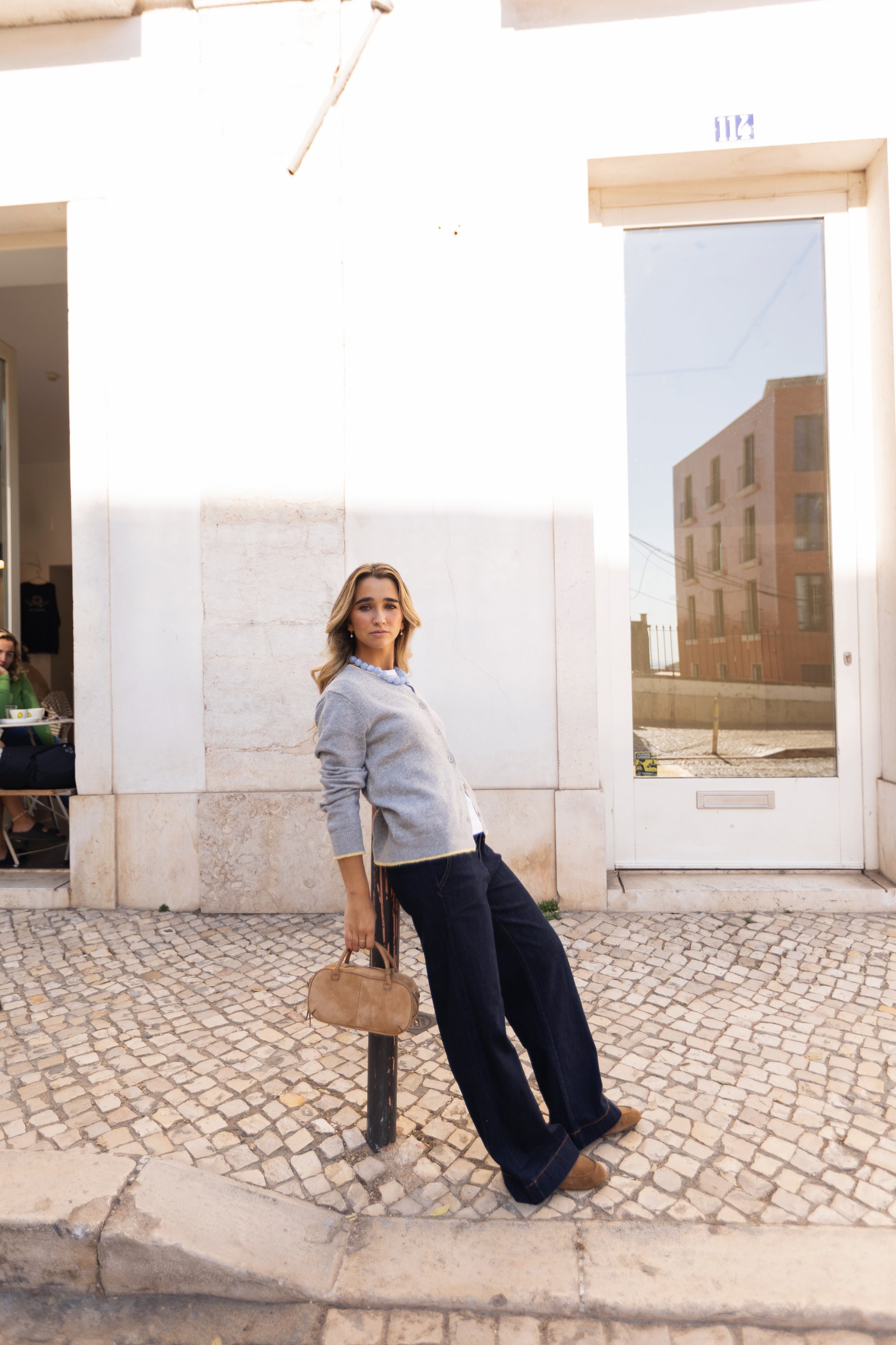 Cardigan de tom cinzento claro, com acabamento em risca fina amarela nas extremidades. De corte reto e estrutura clássica, com botões no mesmo tom do cardigan. Uma peça versátil e confortável, ideal para complementar looks de meia-estação/ inverno.