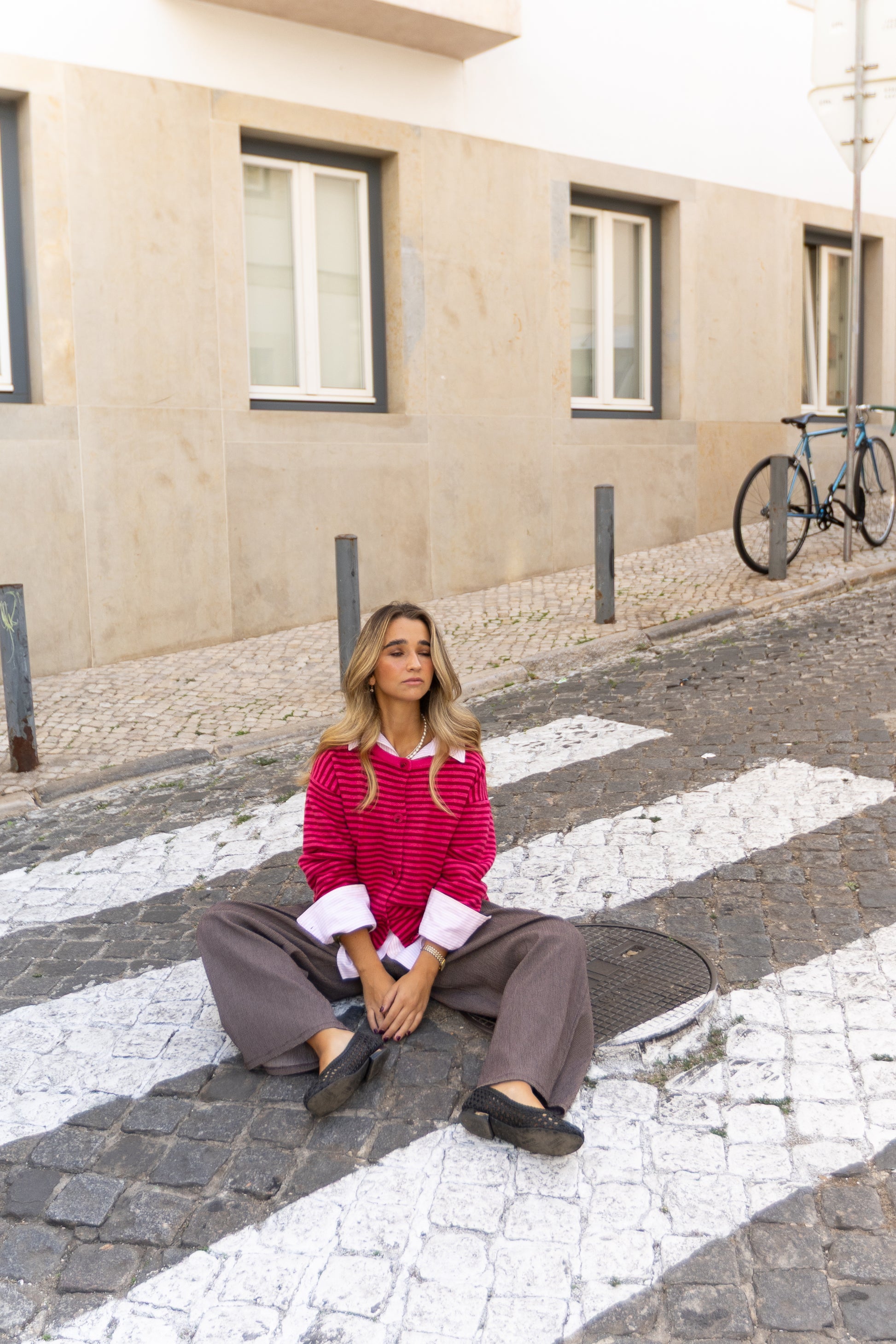 Cardigan com padrão de riscas horizontais em tons de rosa. De corte reto e design descontraído, com botões frontais em degradê que acompanham as cores da malha. Uma peça de textura suave e confortável, ideal para utilizar com camisas ou blusas em looks descontraídos de dia a dia.