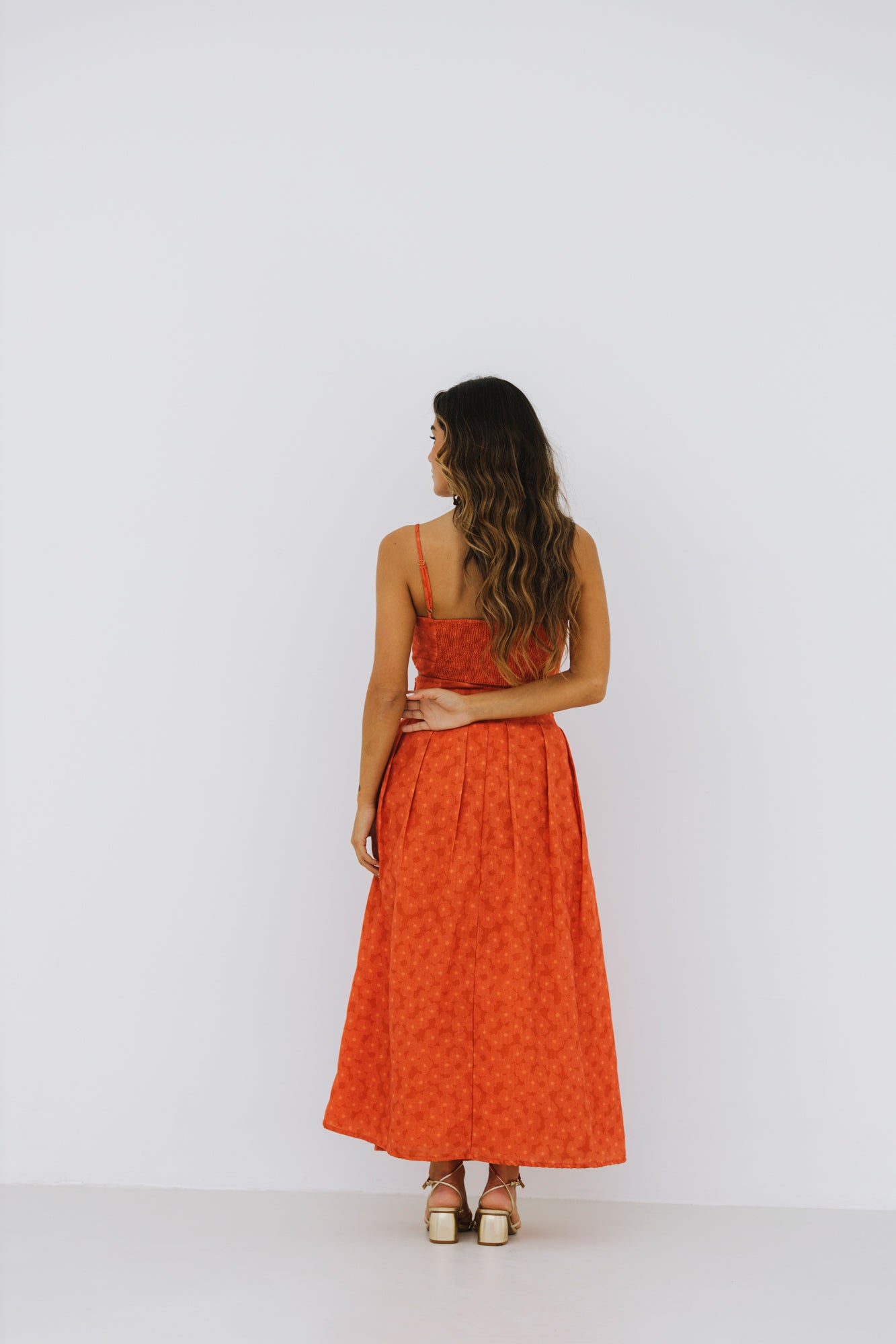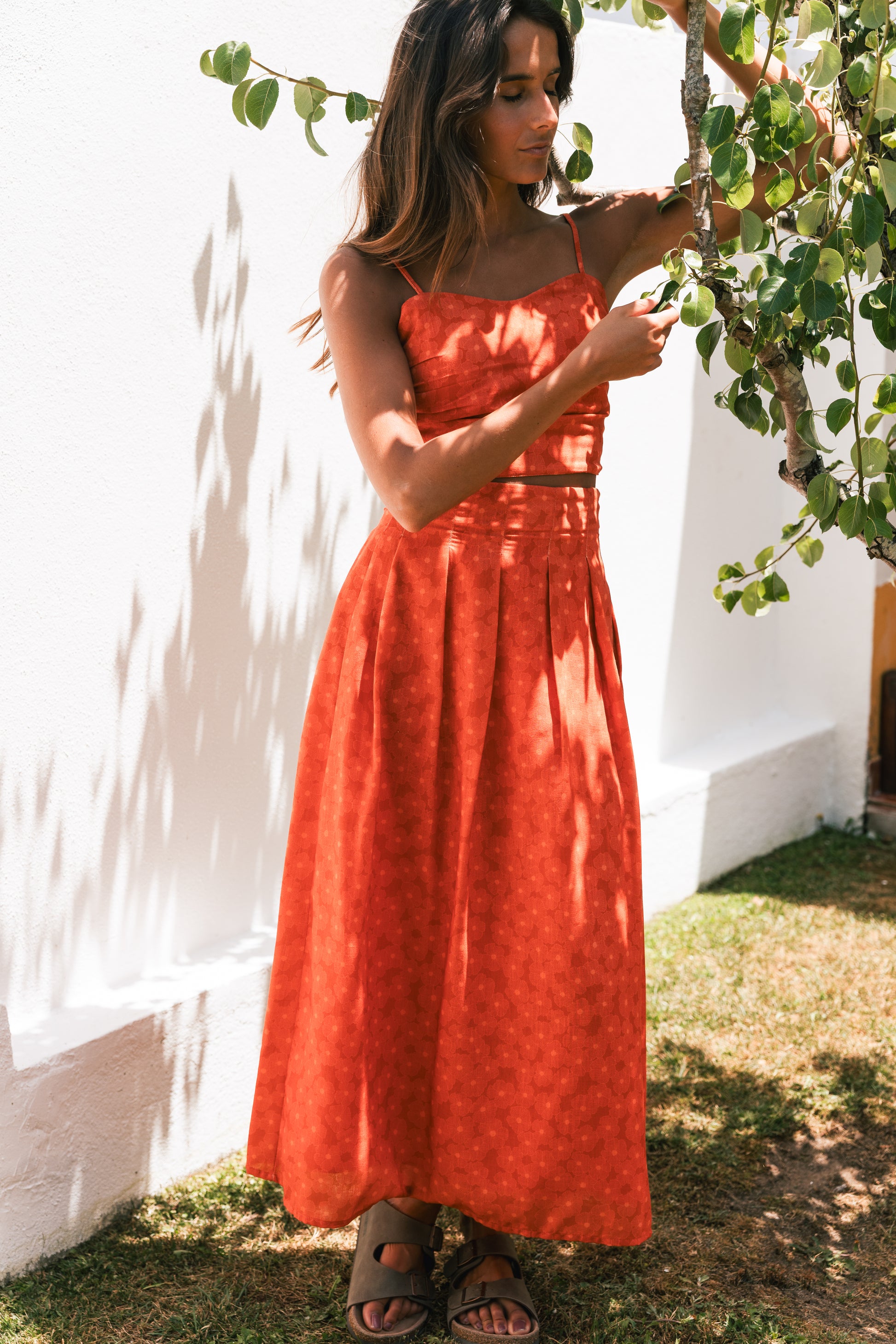 Num tom laranja com padrão floral em tons laranja escuro, é uma peça irreverente, o tecido é bastante leve e texturado, ideal para a primavera/verão.