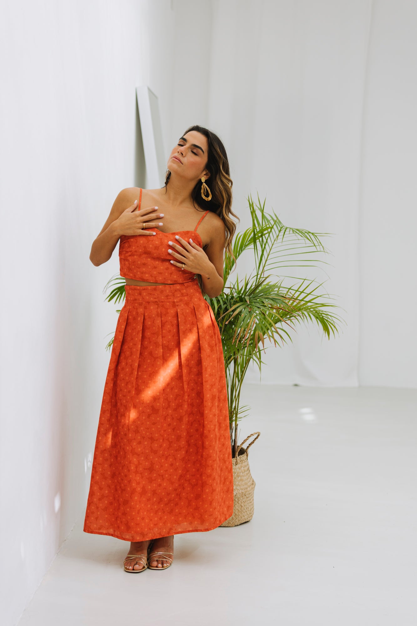Num tom laranja com padrão floral em tons laranja escuro, é uma peça irreverente, o tecido é bastante leve e texturado, ideal para a primavera/verão.