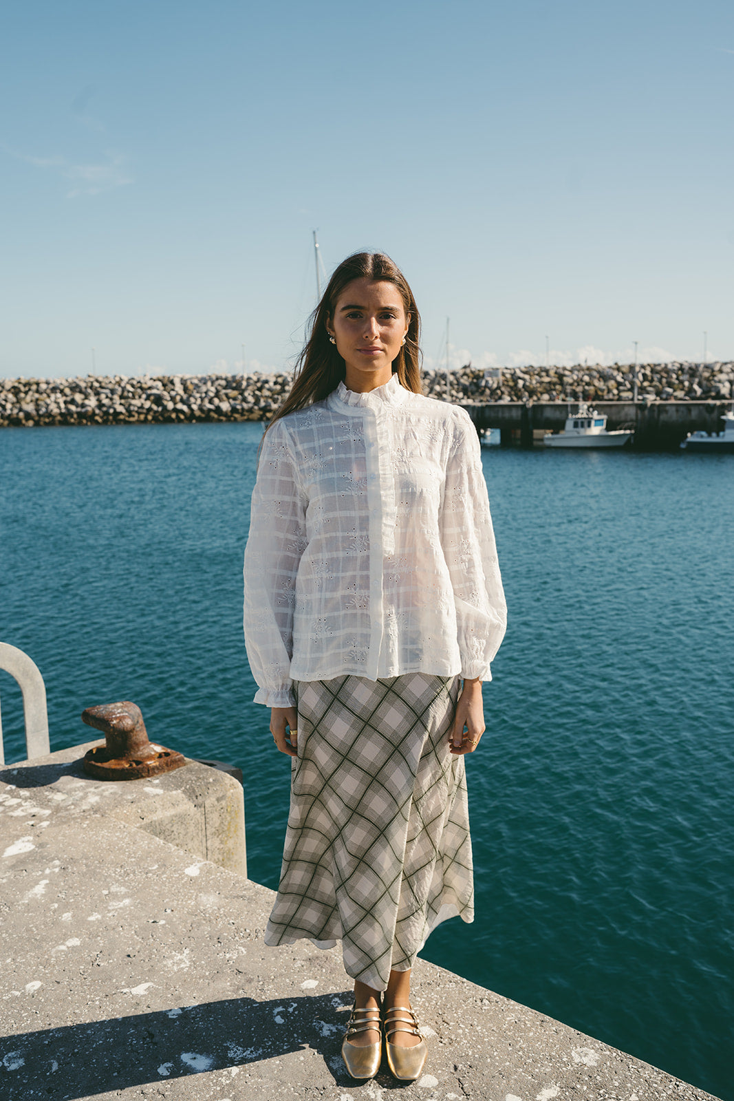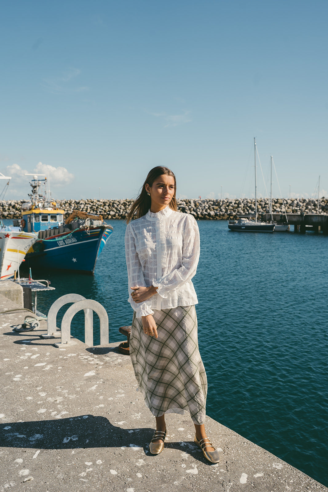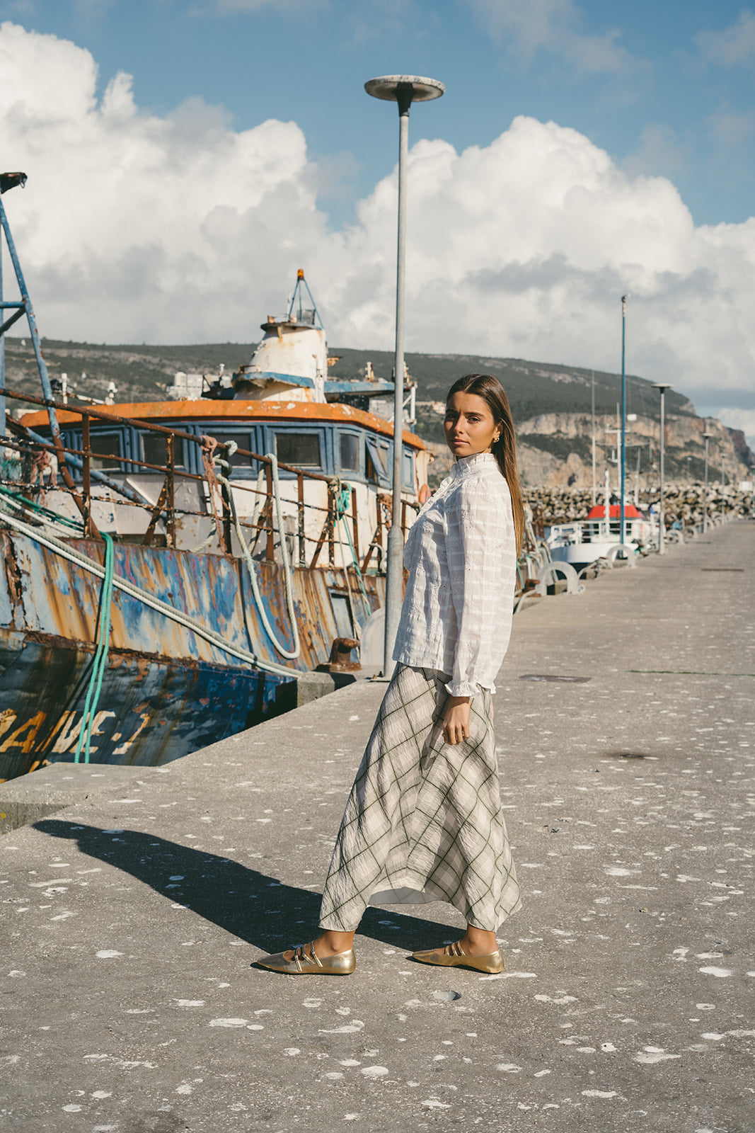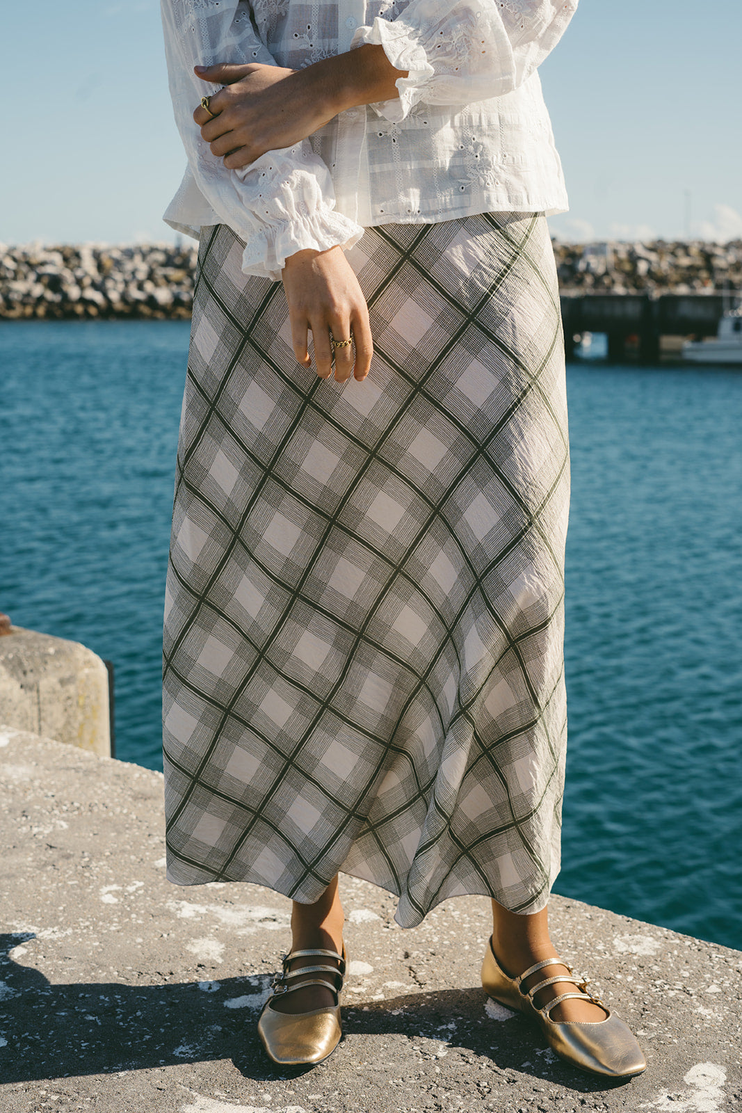 Saia midi fluida com estampado xadrez em tons de verde e creme, o tecido leve garante movimento e elegância, enquanto o cós com elástico proporciona conforto e ajuste perfeito.