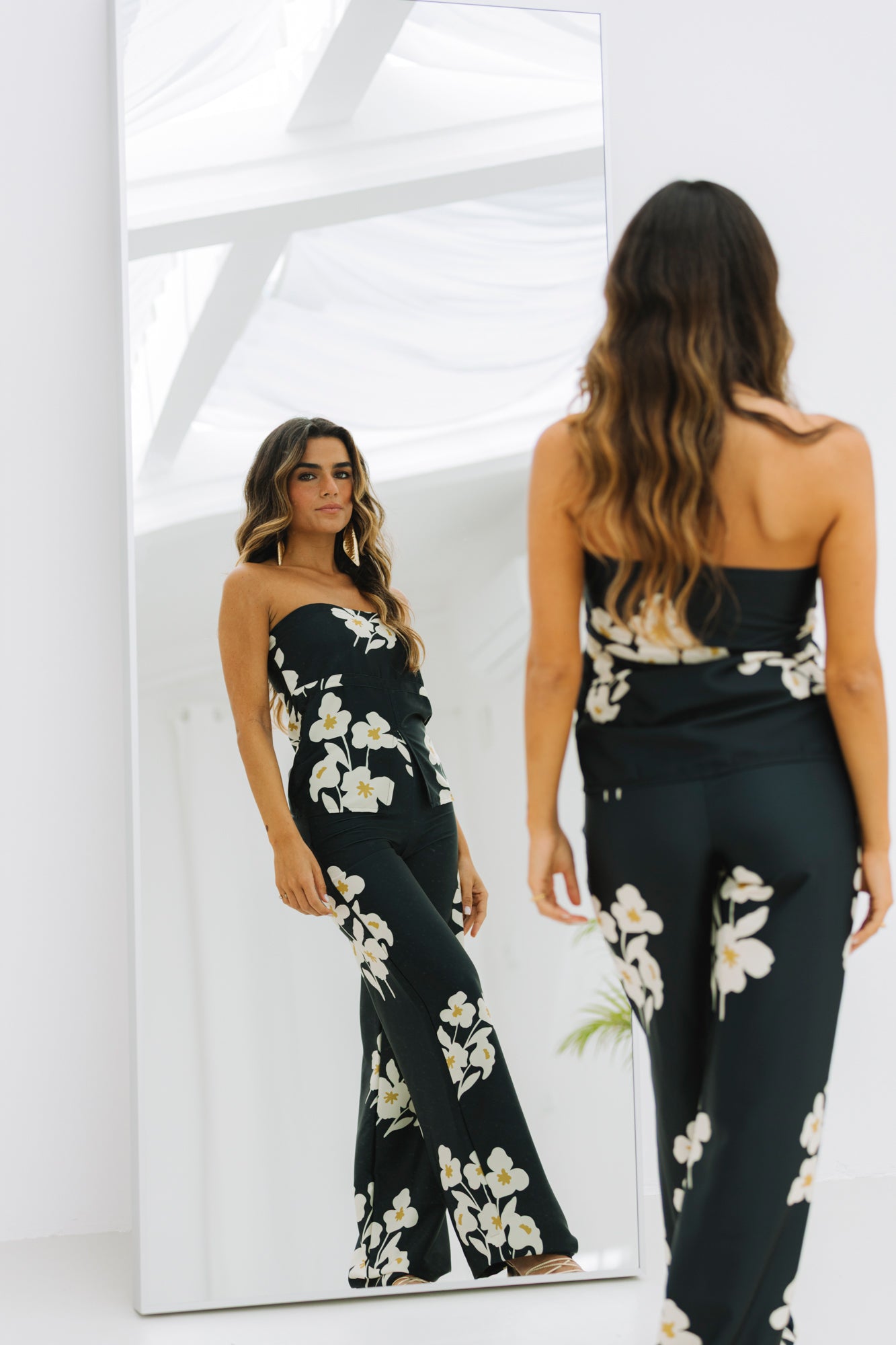 Num tom preto com estampado floral na cor creme e verde lima, é uma peça irreverente, o tecido tem acabamento acetinado, trazendo um toque elegante.