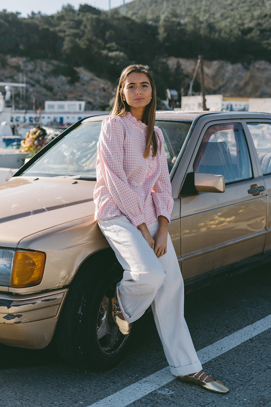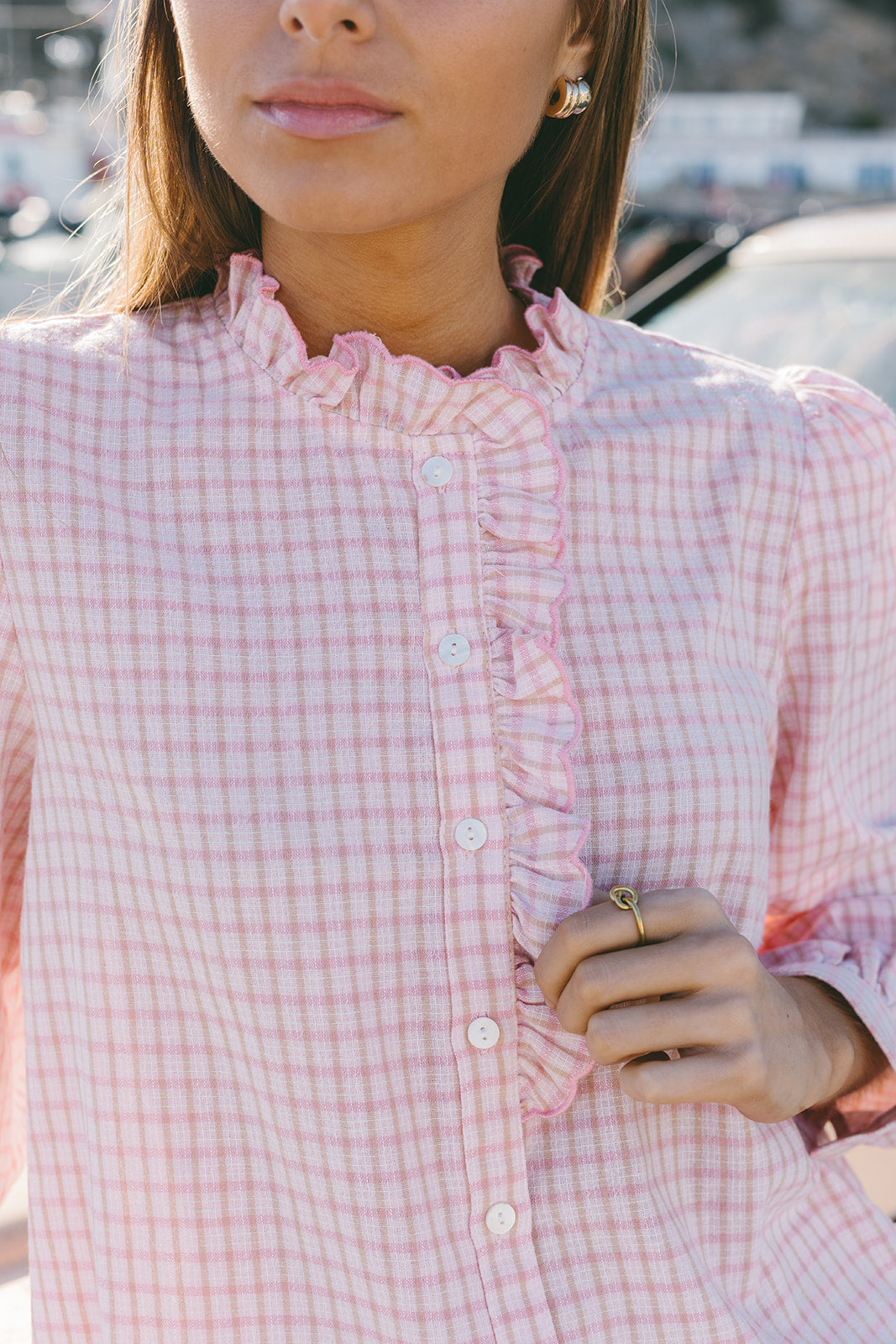 Camisa com padrão vichy em tons de rosa e branco, com o colarinho alto com folhos e detalhes franzidos ao longo da zona dos botões, conferindo um toque feminino e sofisticado. O tecido leve e macio proporciona conforto ao longo do dia, sendo uma peça versátil para diversas ocasiões.