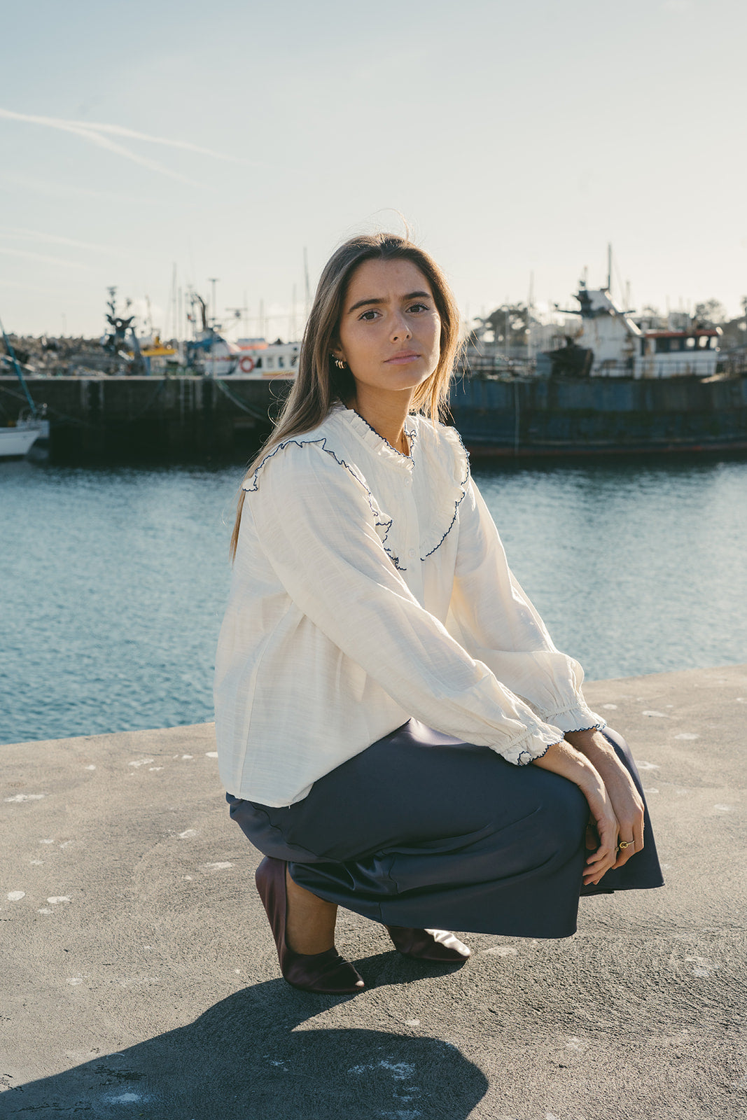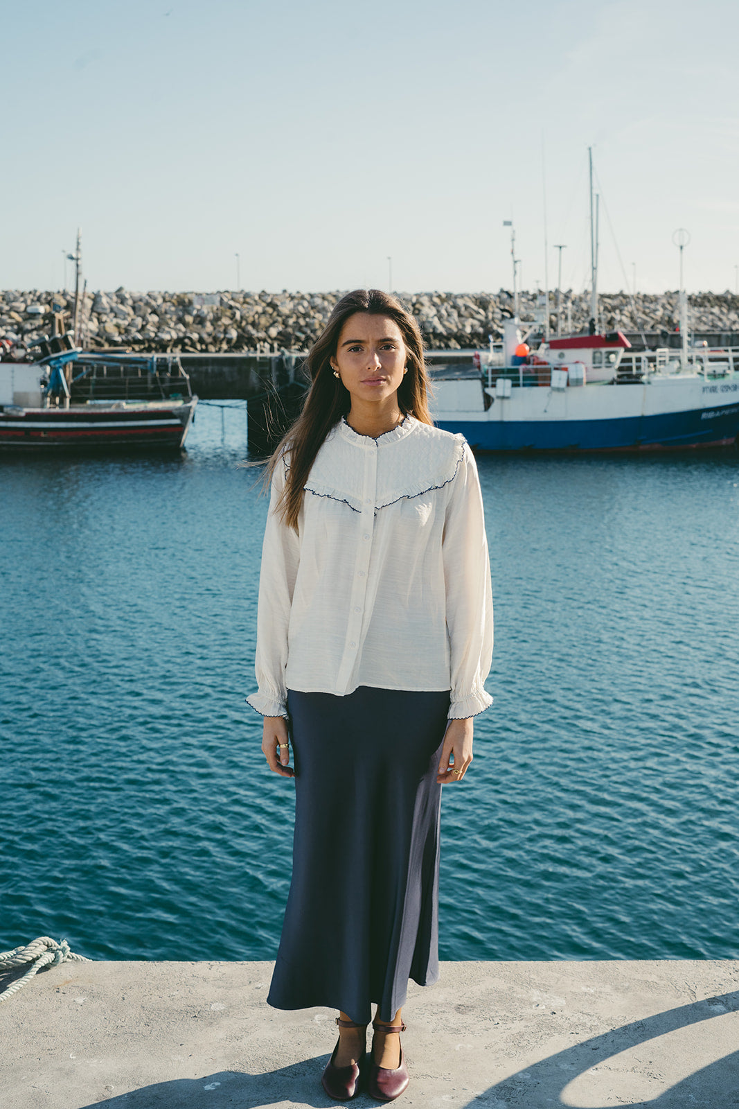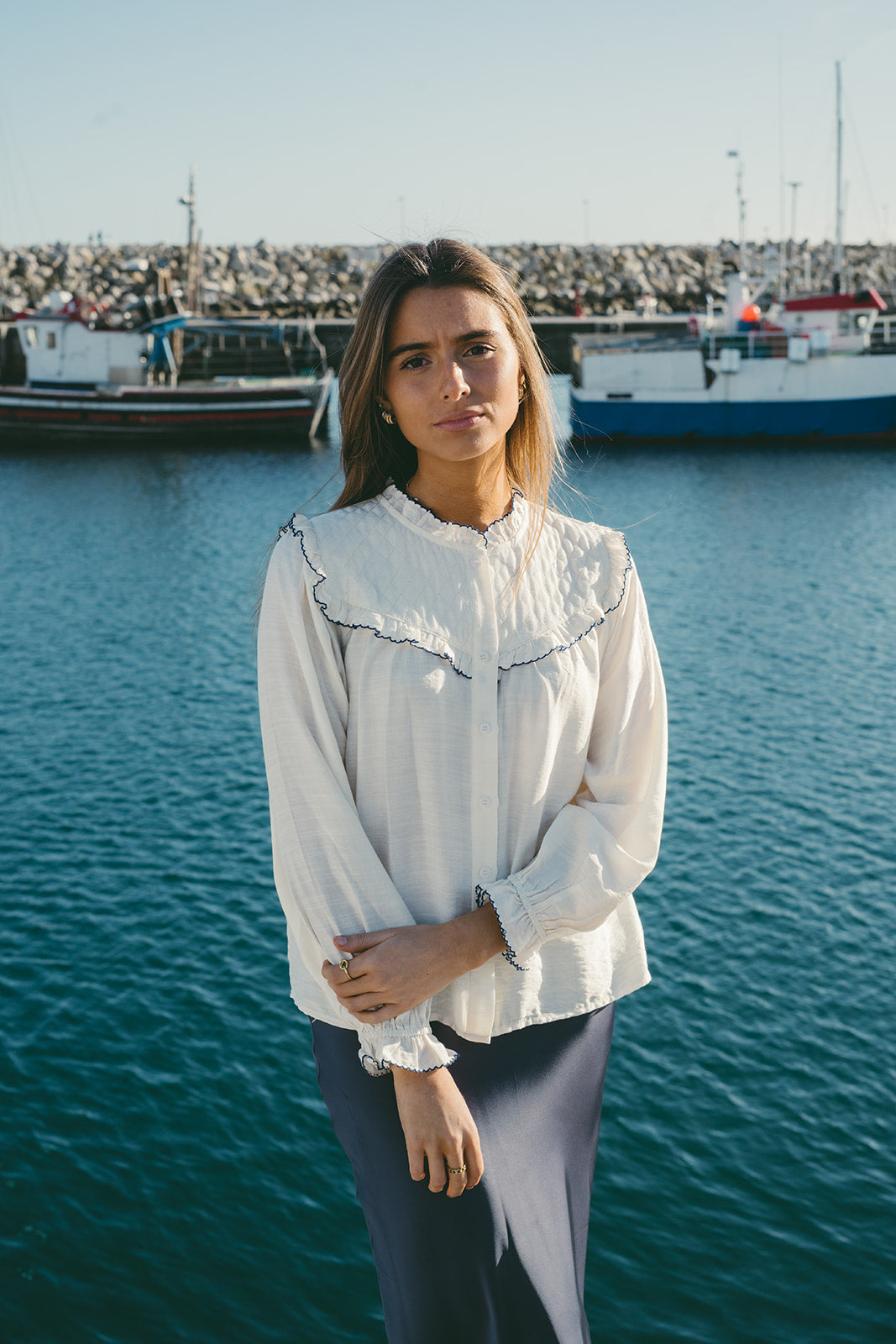 Camisa branca de manga comprida, com um tecido leve e fluído, ideal para um look sofisticado e confortável. Apresenta um detalhe acolchoado na zona dos ombros e peito, rematado com folhos na cor azul escuro, e também tem punhos elásticos com folhos.